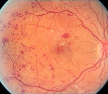 dans la maculopathie, il existe à la fois des occlusions capillaires et un épaississement de la rétine centrale (œdème). L’œdème provient des vaisseaux malades qui laissent anormalement passer leur contenu liquidien vers le tissu rétinien. La rétine se gorge d’eau, et entraîne une gêne à la vision.