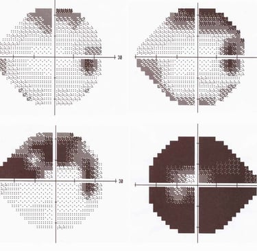 Enfin, le fond d’œil complète l’examen, ce qui permet une analyse soigneuse du nerf optique et de la rétine. Il est souvent nécessaire de dilater les pupilles pour mieux voir le fond d’œil, ce qui provoque une vision brouillée pendant plusieurs heures. Si la pression oculaire est anormalement élevée ou s’il existe des anomalies apparentes du nerf optique, l’ophtalmologiste demande au patient de réaliser un «champ visuel» . Ce test permet de déterminer l’étendue de l’espace que peut voir chaque œil. En cas de glaucome, certaines régions de ce champ de vision sont moins bien vues ou même ignorées du patient, ce qui définit les scotomes. Ce n’est que tardivement que le patient est véritablement gêné, lorsqu’une grande partie du champ visuel a disparu.